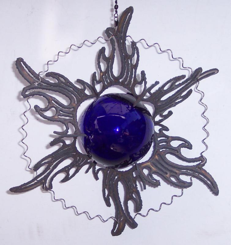 3D stainless steel sun burst with blue glass float center and curly wire ring